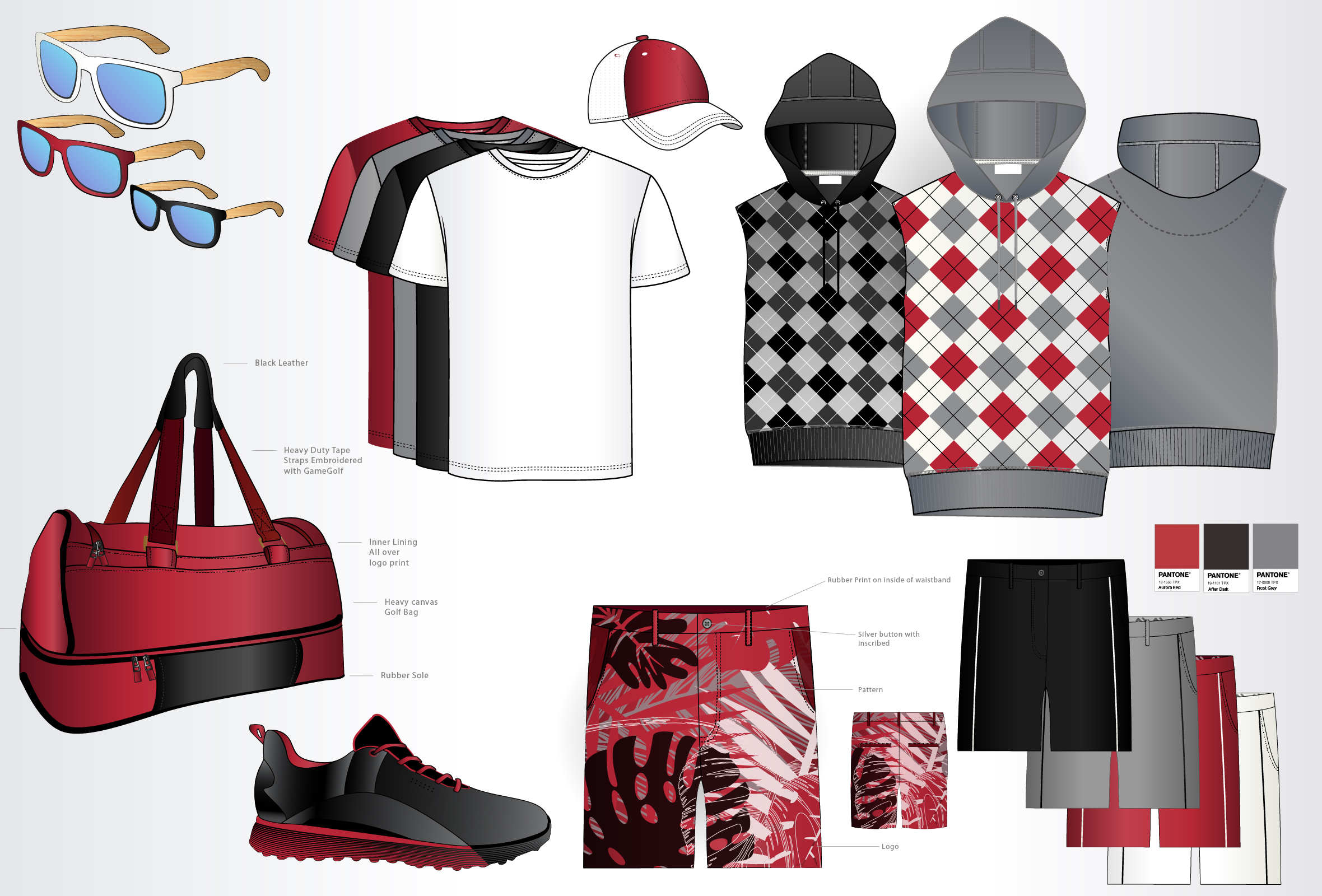 Conceptual renderings of clothing and other items developed for a sports company (name confidential).